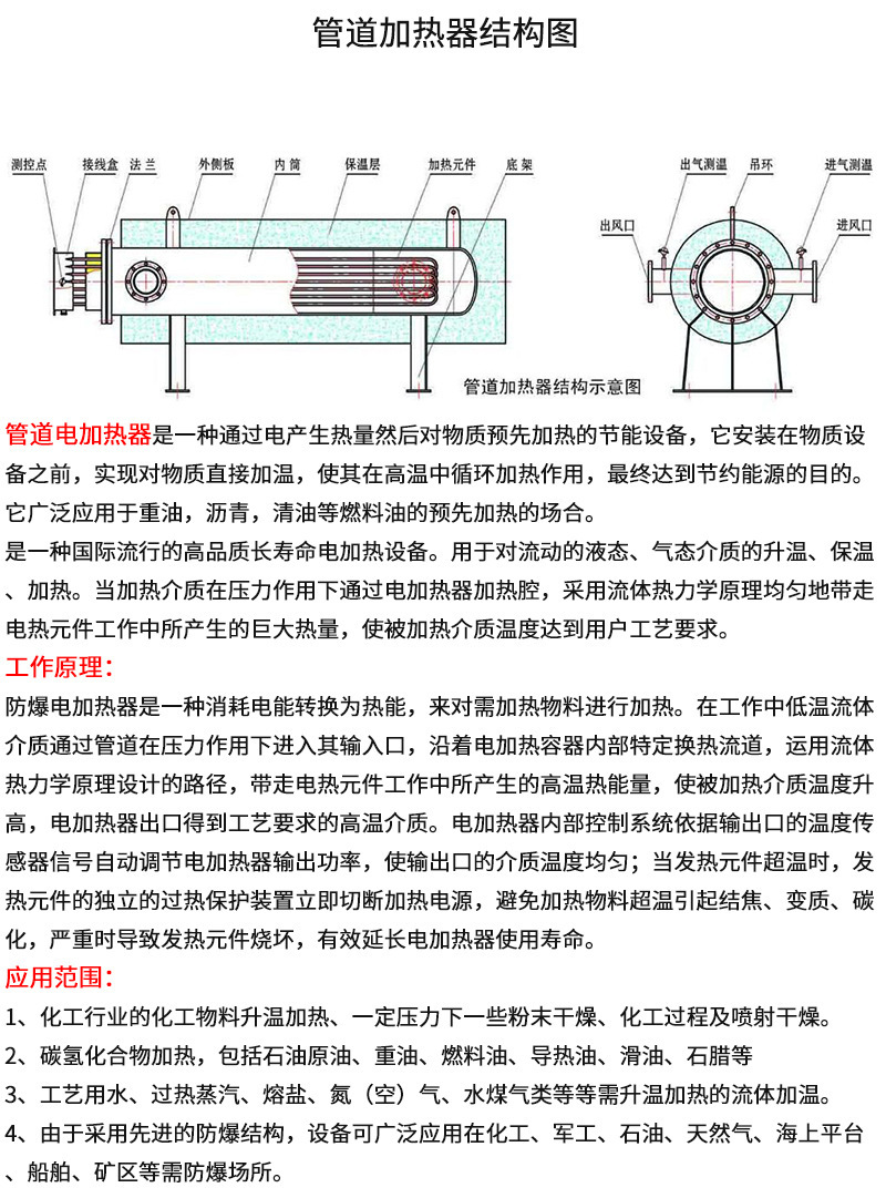 是一种国际流行的高品质长寿命电加热设备。用于对流动的液态、气态介质的升温、保温、加热。当加热介质在压力作用下通过电加热器加热腔,采用流体热力学原理均匀地带走电热元件工作中所产生的巨大热量,使被加热介质温度达到用户工艺要求。